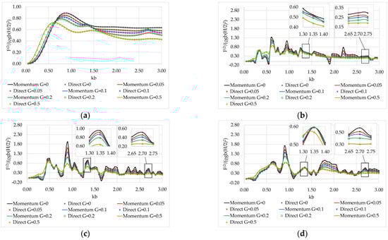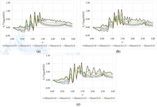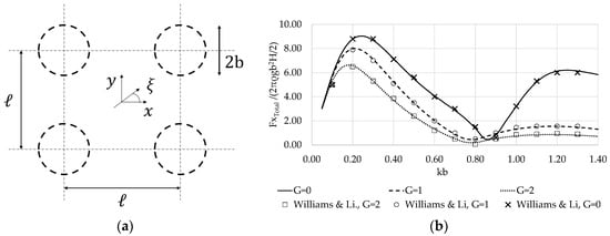 As far as the accuracy of the applied methodology with respect to the interaction phenomena between the bodies of an array is concerned (i.e., the method of multiple scattering), this is verified in Figure 5. Specifically, a four-cylinder array of bottom-mounted and free-surface-piercing porous cylinders in a square arrangement is considered (see Figure 5a). Here the cylinders are identical, each with a radius . Also, , , and . Figure 5b depicts the total horizontal exciting forces in the x-direction on the four-cylinder array for several values of porous coefficients, i.e., . The results are normalized by the term and are compared with the results derived in the work of Williams and Li [48]. An excellent comparison with the outcomes from [48] can be seen in Figure 5b; hence, it can be concluded that the applied methodology can effectively describe the wave interaction phenomena between porous bodies of an array.