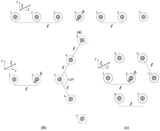 The objective of the numerical work carried out herein is twofold. Firstly, it aims to present the mean drift wave forces on arrays of porous bodies for several different array configurations, and secondly, it examines whether the near-trapped modes are also notable in the mean drift forces in dependence on the distances between the bodies and the porous coefficients. The array configurations chosen for the comparisons are illustrated in Figure 6. These form some indicative arrangements for supporting a pier, a floating building, and a floating PV system (an array of cylinders placed in a row, A1, and in star and hexagonal arrangements, i.e., A2 and A3, respectively) [53,54]. The bodies of the array are considered identical, with geometric characteristics as described in Section 4.1, i.e., (see Figure 6).