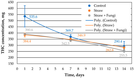 Shaking increases the surface area in the beaker track, and of course, more oil can evaporate from the mixture. This is reflected in the systematically lower values for the extractable THC compared to the control sample in Figure 2. The values of the sorption capacity for straw with and without microbes differ slightly within the error, so that one does not have a clear effect on the effectiveness of the microbes.
