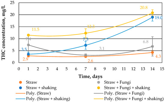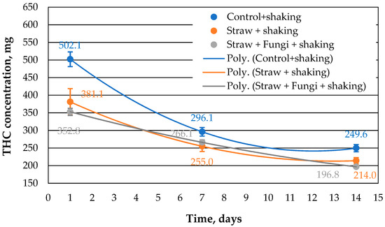 Figure 3 shows the THC concentration in water. Notably, the presence of fungi and simultaneous shaking significantly increases the THC concentration. On the one hand, this could be due to the ability of fungi to form biosurfactants in order to tap the carbon source from the crude oil [19,20], and on the other hand, water surface always had access to air through shaking and the straw. As indicated in [10], the water volume fell partly during the 14-day period. This means that the oil layer on the water was not completely closed, so an exchange of substances in both directions was possible.