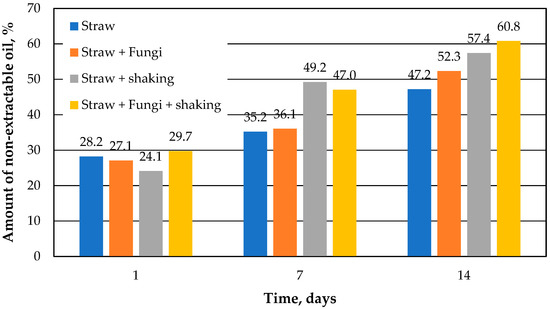 Figure 4 shows a comparison of the percent of the non-extractable oil versus the running time. Non-extractable oil is the difference between the theoretical extractable amount of oil, which is identical to the control sample, and the amount of oil actually determined. It can be seen that the amount of non-extractable oil in the straw increases over the course of 14 days, which has already been shown [10]. This can probably also be assumed for the straw samples with immobilized microbes. Slow desorption kinetics due to the inner morphology of the straw was already assumed in [10] to be the cause for the non-extractable amount.
