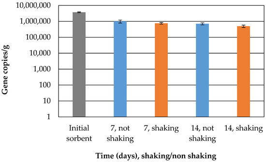 For fungal quantification, sorbents were sampled in three stages under two treatments (with and without agitation): at the initial stage (before the start of the experiment (time 0)), and after 7 and 14 days. The DNeasy PowerSoil Kit (Qiagen, Singapore) was used to extract DNA from the sorbents (up to 200 mg of sterile sorbents). Before extraction, sorbents were cut into smaller pieces under sterile conditions. The extracted DNA was used as a template for PCR reactions. The β-actin gene, characteristic of the fungal genome, was used to quantify fungal cells in the sorbents [17]. Quantitative real-time PCR was performed using a StepOnePlus™ Real-Time PCR system (Applied Biosystems, Carlsbad, CA, USA) using the SYBR Green PCR Master Mix (Thermo Fisher Scientific). Each 20 μL reaction contained 10 μL SybrGreen, 0.25 μL of a 10 pmol/μL primer solution using the β-actin primers, ACT 512-F (5′ ATG TGC AAG GCC GGT TTC GC 3′) and ACT 783-R (5′ TAC GAG TCC TTC TGG CCC AT 3′) [18], 8.5 μL H2O, and 2 μL of the DNA template. The amplification conditions were 95 °C for 10 min and then 40 cycles of 95 °C 15 s, 61 °C 20 s, and 72 °C 15 s. For each sample, the analysis was performed in triplicate. Fluorescence measurements were made at the end of each annealing cycle and at an additional measuring point at 80 °C (for 1 s) to detect the formation of primer dimers during amplification. A melt curve analysis was made by raising the temperature from 65 to 95 °C in 0.5 °C steps for 5 s each. Standard curves based on threshold cycles were generated by re-amplifying the dilution series of PCR products 10 times from fungal genomic DNA, and an aliquot of each dilution in 3 replicates was used for real-time PCR.
