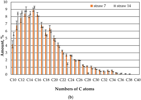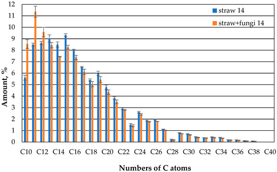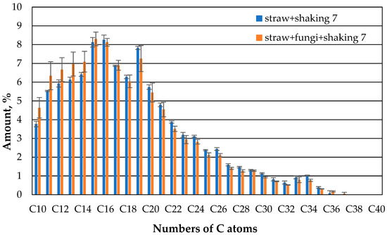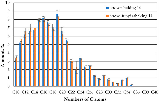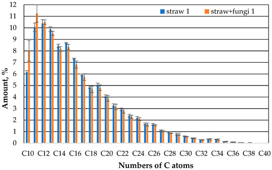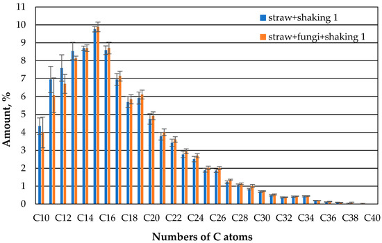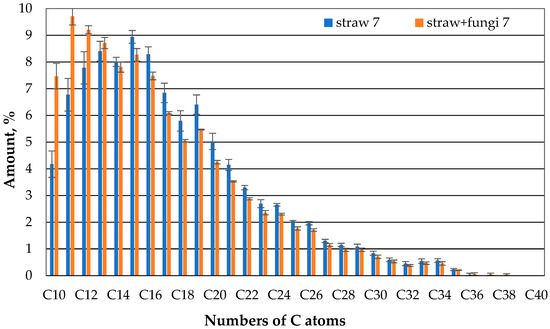 The comparison of the gas chromatographic composition of the oil of the straw with fungi and the straw without microbes after one day shows that clearly less oil evaporates in the case of the straw with microbes than in the case of the straw without microbes compared to the case of compounds with 10 or 11 carbon atoms (Figure 7). There is no apparent difference between the straw with and without microbes for the higher hydrocarbons.