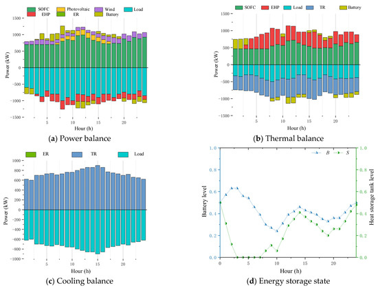 - Thermal energy management: The main heating pump serves as the primary heating device. Its thermal energy is utilized to fulfill the ship’s thermal load demand and meet the thermal energy requirements of the thermal refrigeration unit. Additionally, residual heat generated during SOFC runtime can be recycled to supplement thermal energy needs and efficiently fill the heat storage equipment. When the electric heating pump cannot meet the heat load demand, adjusting the operation of thermal refrigeration units and increasing the energy consumption of electrostatic refrigerators can reduce the reliance on thermal energy.