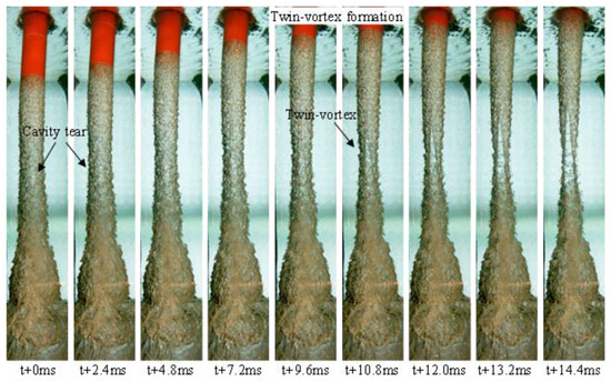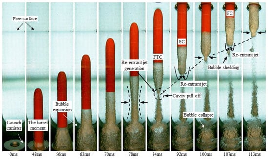 Cavity pulsation process (84–113 ms): Because of a continuous vertical motion of the vehicle, the columnar cavity cannot maintain a cylindrical shape, leading to the cavity breaking phenomenon. At the moment of cavity breaking, the end closure of the attached cavity shows a white foam shape accompanied by the re-entrant jet phenomenon and rapidly develops to both the ends of the cavity fracture. The cavity formed at the outlet of the launcher and the re-entrant jet rushes toward the tail of the vehicle, causing a periodic pulsation of the cavity. The pulsation period is shown in