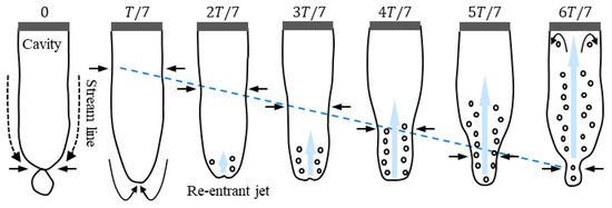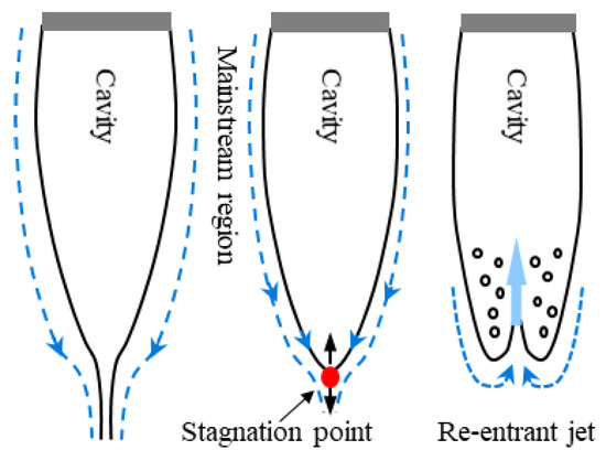 Figure 3. In the pulsating process, the end of the bubble is narrowed under the action of the re-entrant jet, and the cavity formed is a shrinking cavity (SC). At the same time, the action of the jet makes a large amount of water enter the cavity, and under the joint action of cavity breaking and contraction, a part of the gas at the bottom of the cavity is squeezed to the upper end of the cavity. Thus, the radial size of the upper end of the cavity expands, and the lower end contracts. Because of a remarkable scouring effect of the incoming flow, the radially expanding cavity cannot maintain the expansion state and moves downwards and contracts. When the re-entrant jet hits the tail of the vehicle, it is blocked from spreading to the circumferential direction. This further increases the gas and water content in the cavity and changes the gas distribution inside the cavity, thus forming unstable fluctuations on the surface of the cavity.