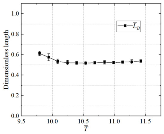 Figure 17, it was found that with the decrease in the cavitation number, the length of breaking time of the cavity also increases. The smaller the cavitation number, the smaller the water depth, and the smaller the variation in the cavity length. However, under a large cavitation number, due to the effect of bubble shedding, the change amplitude of the cavity length is larger.