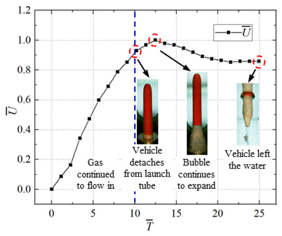Figure 6. In the early stage of the motion of the vehicle, the speed increases rapidly, and then the rate of speed increase slows down, but before the vehicle leaves the launcher outlet, the speed is always accelerated. When the vehicle is separated from the launch cylinder, the gas in the cylinder expands rapidly, and the speed of the vehicle remains accelerated at this time, indicating that the gas expansion process has a driving effect on the vehicle. When the air mass at the outlet of the launcher expands to the maximum, the speed of the vehicle reaches the maximum. Subsequently, the cavity at the tail of the vehicle was separated from the air mass at the mouth of the tube and lost the continuous propulsion of the launched air mass to the vehicle. At the same time, the vehicle was affected by the resistance of the water body during the movement, and its speed decreased.