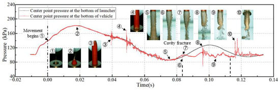 The pressure change of the cavity during movement has always been the focus of many studies. To better illustrate the motion characteristics of the tail attachment cavity, this section continues to analyze the pressure variation of the tail attachment cavity of the vehicle under case 1 by installing pressure sensors at the center of the bottom of the vehicle. The pressure data of the tail attachment cavity recorded by the pressure sensor at the tail of the vehicle were compared with the pressure data at the center point at the bottom of the launching cylinder, as shown in