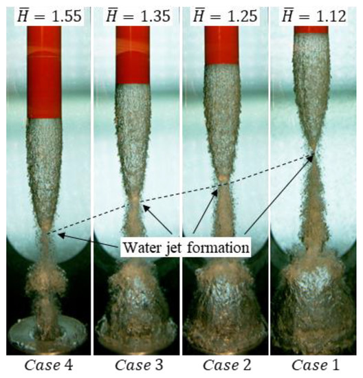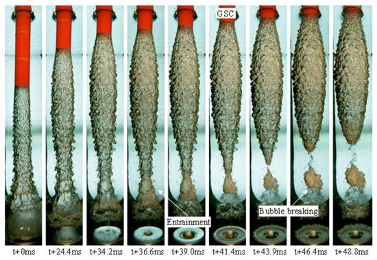 Figure 9. It can be observed that with the decrease in ventilation flow, the size of the cavity at the outlet of the launcher decreases substantially, and the position where the cavity breaks down also decreases. The jet occurs at the initial moment when the cavity breaks.