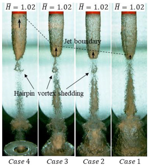 Obviously, the jet impact generated during cavity breaking has an important influence on cavity pressure pulsation. To better observe the effect of jet impingement on cavity dynamics, we evaluated the relationship between different ventilation flow rates and cavity morphologies, and selected cases 1–4 for comparison, as shown in
