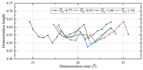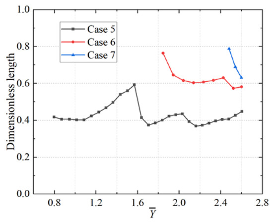 Figure 12, it can be found that the cavity length experienced a decreasing trend in the initial stage, and then the cavity length increased with a sudden drop. This is because the length of the tail attachment cavity is the largest at the moment of breaking, and the size of the cavity is reduced due to the shrinkage of the cavity after the breaking because the internal pressure of the cavity is lower than the external pressure. At the same time, the length mutation caused by the shedding of terminal bubbles occurred during the movement. It can be found that with the increase in ventilation flow, the frequency of cavity shedding also decreases. On the other hand, the air mass at the mouth of the barrel increases with the increase of the ventilation flow rate, and most of the gas stays at the mouth of the launching barrel. However, the length of the cavity at the tail of the vehicle does not change significantly with the ventilation flow rate, which indicated that the factor of ventilation flow rate had little influence on the cavity length. The Strouhal numbers are