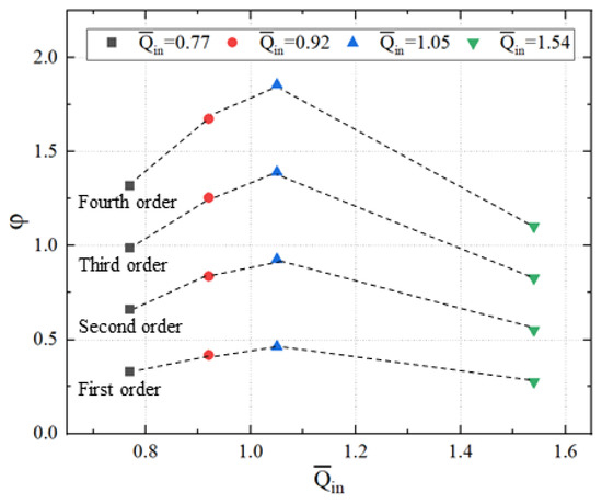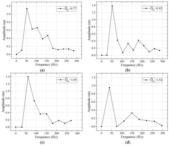 Figure 14. It can be found that under different ventilation flow rates, the maximum amplitude of cavity shedding is near 50 Hz in the low frequency region. By summarizing the cavity shedding frequency under different ventilation flow rates, it can be found that the shedding frequency presents a trend of first increasing and then decreasing.