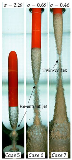 Figure 20 shows the flow pattern distribution of the tail attachment cavity with ventilation under different cavitation numbers.
