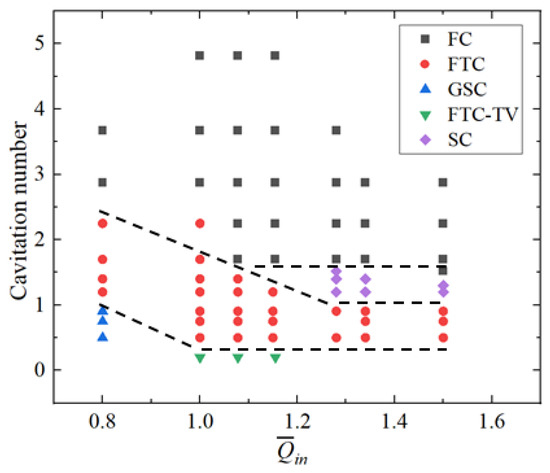 Figure 20 shows that under different ventilation volumes, the cavity morphology has experienced the evolution of FTC-FC. Among them, the GSC only appeared at a low cavitation number and small ventilation volume. With the increase in ventilation volume, the FTC-TV cavity mode appeared. The shrinkage cavity (SC) exists in the transitional stage of transition between the transparent cavity FTC and FC, and only exists in the working condition of a large ventilation volume. When the attached cavity is close to the water surface, the FC appears, because the velocity decreases near the free liquid surface. At the same time, under the impact of the jet, the air and water are strongly mixed, which makes the cavity appear foamy.