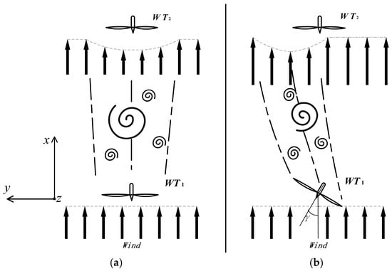 In Figure 1a, in the case of the wind speed below the rated speed, the turbine WT1 is in free flow and has no control over the wake, γ and β are 0°, and the power of WT1 reaches the optimum. At this time, the wind speed of the wake is very low, the turbulence intensity is high, and WT2 is seriously affected by the wake, resulting in the decrease of WT2 power and the increase of fatigue load []. The CYMP method is a combination of yaw misalignment and pitch control. Yaw misalignment makes the wake steer, and the downwind turbine far away from the wake centre. The upwind turbine reduces the thrust to the wind through pitch while reducing the thrust to the wind of the upstream turbine will reduce the turbulence in the wake [].
