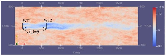 As shown in Figure 2, the scenario of two wind turbines with spacing x/D = 5 is selected. The average wind speed (v) of 7.5 m/s is observed in simulation. The wind characteristics of this region are: (a) obvious wake interference; (b) when the wind speed is lower than rated, the pitch control is easy to achieve. The characteristics of turbine operation in those regions are: (a) the rotor speed increases and the is 0°; (b) the rotor speed control follows the optimal Cp tracking. Turbulence intensity (TI) of 6%; a wind shear (kv) of 0.13, air density () of 1.225 kg/ are typical offshore wind characteristics, and the distance of the two wind turbines in the wind direction is 5D.