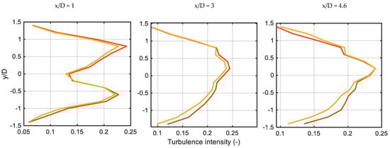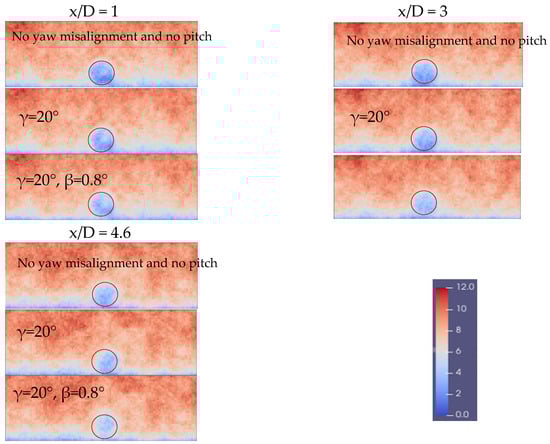The wake recovery is generally considered from two aspects: wake deficit and wake turbulence. As shown in Figure 6, the controls with and make the wake deficit centre offset to the right (y < 0) by 0.2 times the rotor radius (R) because of the upwind turbine yaw misalignment. The energy capture capacity is the largest at the position of 0.6–0.8 times the rotor radius (0.6–0.8R) from the center of the hub, and the wake deficit is the most at 0.6–0.8R as shown at x/D = 1. With the evolution of wake downwind, compared with at x/D = 1, the wind speed of x/D = 3 at 0.6–0.8R recovers rapidly. At x/D = 4.6, the wind deficit at the wake centre is the most, and the closer to the boundary, the lower the wind deficit.
