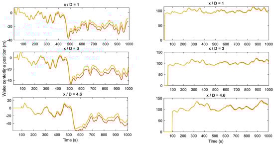 Wake centre-line offset on the y-axis (left) and z-axis (right). Note: The red line means control with ; The yellow line means the combination control with .