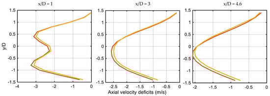 Spanwise profiles of the velocity deficit at the hub height for the incoming flow. Note: The red line means control with ; The yellow line means the combination control with .