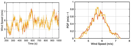 Wind speed variation (left) and PDF (right) in the hub centre of WT2. Note: PDF is an abbreviation for probability density function, which represents the probability distribution of wind speed. The red line means control with γ = 20°; The yellow line means the combination control with γ = 20°, β = 0.8°.