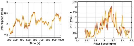 Rotor speed variation (left) and PDF (right) of WT2. Note: PDF is an abbreviation for probability density function, which represents the probability distribution of wind speed. The red line means control with ; The yellow line means the combination control with .