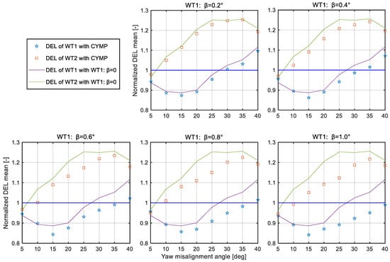 To study the impact of CYMP on the performance of the wind turbine, more simulation cases are studied, which are listed in Table 3. The yaw misalignment angle varies from 0° to 40° (positive for clockwise yaw) with a gradient of 5°; the pitch angle changes from 0° to 1.0° with a gradient of 0.2°. The fatigue load and total power of CYMP are shown in Figure 10 and Figure 11, respectively. The results are normalized by the value of no yaw offset and no pitch. As shown in Figure 10, the turbine blade root out-of-plane moment is used to calculate the damage-equivalent loads (DEL) and is normalized by the WT1 DEL value of no yaw misalignment and pitch. When the CYMP with is chosen, the control with clockwise yaw misalignment of WT1 makes the DEL of WT1 decrease, which is consistent with Kragh’s research []. The fatigue load of WT2 is increased because of the partial overlaps. The fatigue damage of WT1 and WT2 under the CYMP method is both lower than that of the control with . When the WT1 pitch angle is 1.0°, the fatigue damage of the two turbines decreases the most. When the yaw misalignment angle is 30°, the fatigue damage of WT1 is decreased by 9.94%. When the yaw misalignment angle is 25°, the fatigue damage of WT2 is decreased by 10.29%. Therefore, the high fatigue load of WT2 caused by yaw misalignment can be effectively reduced under the CYMP method.