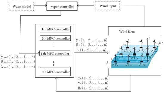 MPC is a commonly used control method for wind turbines. According to the control needs of offshore semisubmersible floating wind farms, this paper proposes CoMPC. The framework of CoMPC is shown in Figure 12. The supercontroller is for wind farms, and the optimization algorithm “Fmincon” calculates the optimal references, including yaw angle, pitch angle, and rotor speed of each wind turbine corresponding to the optimal target, and considers the free-flow wind speed, wind direction, and wind-turbine arrangement. Then the supercontroller transmits the optimal operating value of the wind turbine to each MPC controller. The MPC controller tracks the reference value and controls the wind-turbine action. At the same time, the operating data and wind of the wind farm are fed back to the supercontroller continuously and each MPC controller for real-time adjustment of optimal value selection and tracking of control actions, realizing dynamic active wake control of CYMP.