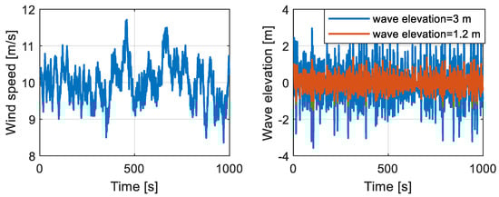 According to the wind-condition characteristics of an offshore wind farm, the simulated v is 10 m/s, TI is 6%, Kv is 0.13, and the wave height (WH) are 1.2 and 3 m, respectively, with Gaussian white noise. Wind-speed changes and WH changes are shown in Figure 14.