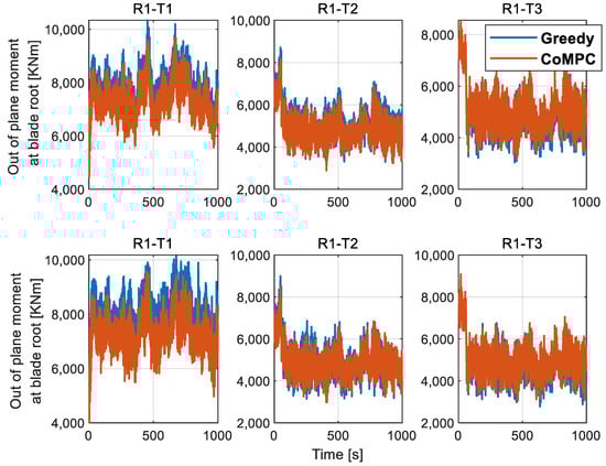 As shown in Figure 17, under CoMPC control, the out-of-plane moment at the blade root of R1-T1 and R1-T2 wind turbine decreases compared with the Greedy control. In contrast, under CoMPC control, the power capture of the R1-T3 wind turbine increases, and the corresponding out-of-plane moment at the blade root increases, but very little.