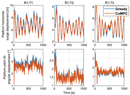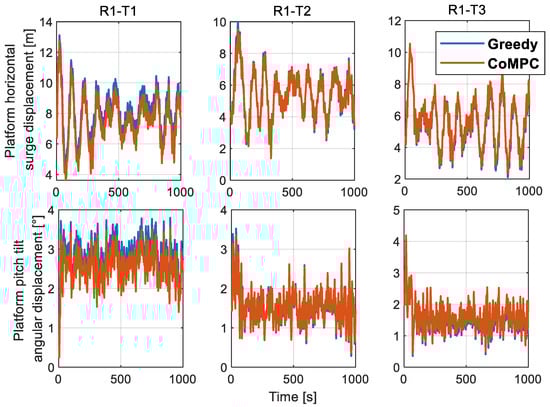 The movement of the semisubmersible floating wind turbine platform is an important criterion for evaluating wind-turbine operation. As shown in Figure 18 and Figure 19, under the control of CoMPC, the surge displacement and pitch tilt angular displacement of the R1-T1 wind turbine are large and significantly reduced. In contrast, the R1-T3 wind turbine still increases slightly due to the increase in power capture, but the motion range is still small.