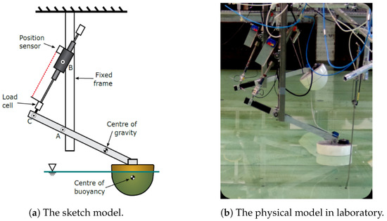 The scaled Wavestar-prototype device is a kind of wave-activated body WEC, as shown in Figure 1. A hemispherical float is mechanically connected to an arm that can rotate around a fixed hinge point A [11], which has three independent motions (surge, heave and pitch). At the other side of the arm, a linear motor (power take-off system) is attached on the rotating arm to provide the power take-off force, and it only has one degree of freedom.