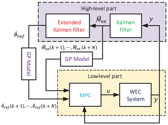 On the basis of MPC and the hierarchical structure strategies, this paper combines them and produces a model predictive velocity tracking control approach for maximum energy extraction. As for the second or high level part of the hierarchical structure, the WEM is estimated by a Kalman filter, and reference velocity profile calculation is set in it. On the other hand, the reference velocity computation requires the instantaneous amplitude and frequency of the WEM, which are estimated by the EKF in this paper. Theoretically, the WEM is assumed to be a narrow-band harmonic process and modeled as a single cyclical component based on Harvey’s structural model [21]. Following this, on-line estimation can be performed to obtain the angular amplitude and frequency of WEM by the designed EKF in order to compute the reference velocity. Next, model predictive tracking control is placed in the low-level part of the whole designed structure. The objective function comprises the velocity error signal and control input and is transferred into a quadratic index to reach its minimum with input constraint. However, the future excitation moment and future reference velocity information are required to be predicted and used in the MPC objective function. Usually, an autoregressive model is used for the prediction of the WEM [22]. However, for the real-time forecasting requirement, the AR model needs to be updated, which will increase the prediction time. Here, two GP models are chosen instead to provide the short-term forecasting [23]. The hyperparameters can be preselected before the training process to reduce the prediction time with no need for them to be updated during real-time forecasting. Besides this, since the GP is a kernel-based and nonparametric learning method, it has the advantages of modeling flexibility, as well as prediction with learning smoothness and the use of noise parameters based on a training set.