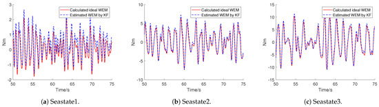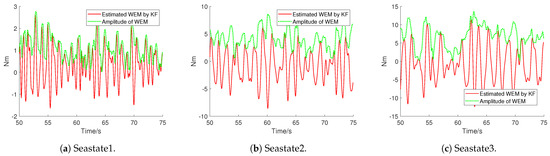 Figure 3 presents the estimated from the KF over the time interval 50–75 s. It can be seen that some biases arise in the crests of the estimated WEM due to the WEC-Sim numerical model having some additional static moments and the offset between the center of bouyancy (CoB) and center of gravity (CoG). Additionally, a small lag of about 0.05 s occurs between the estimated and the calculated . The reason for this lag is that a relatively large sampling time has to be utilized for the requirement of the QP solving time in MPC due to its computational complexity. The sampling time is 0.05 s, which is larger than the most frequently used sampling rate (0.001 s). This means that the KF will not produce the most accurate estimation performance with zero lag, but the estimation performance is acceptable.