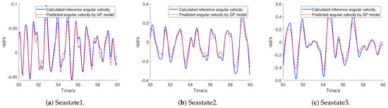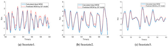 Two GP models are employed to provide the future WEM and velocity information for MPC tracking design. In other words, the predicted future WEM sequence and future reference velocity sequence are used in the MPC objective function. It is clear that, most of the time, the predicted WEM based on the GP model is matched well with the calculated ideal WEM in Figure 6. The GP modeling method shows good learning smoothness and accuracy for WEM prediction. The suitable hyperparameters of the GP model can be preselected before the training process to reduce the prediction time and promote the convergence rate of optimization. There is no need to update the hyperparameters during the real-time forecasting. From Equations (14) and (15), the wave excitation moment and reference angular velocity share the same phase but a different amplitude when the tracking control is achieved for the WEC system. Hence, the predicted future reference velocity shows similar trends to the predicted future WEM in Figure 7.