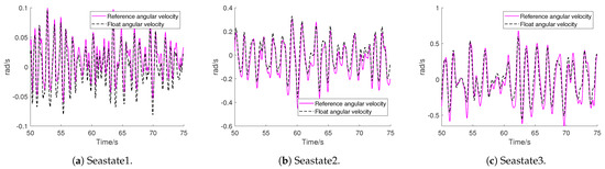 The MPC angular velocity tracking result is shown in Figure 8. To start from the MPC standpoint, the overall tracking performance is good, even if the float velocity shows occasional amplitude differences with the reference velocity. However, the tracking errors between the reference velocity and float velocity are small and acceptable. Most of the time, they share the same phase. The primary role of the reference velocity is to capture the same phase with the estimated so as to reach a near resonance condition for energy-maximizing purposes. This means that the WEC system is forced to follow the incident waves by MPC when the tracking mission is obtained. In total, the MPC method lacks some robustness to a certain extent, which is unlike the other robust methods, which can result in very small tracking errors for the WEC system doing the tracking work. However, the MPC has a good advantage in terms of input constraint handling.
