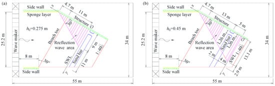 Horizontal layout of the experiment on the planar beach (a) for Test P and barred beach (b) for Test B and Test C. Red lines planar beach; blue lines sandbar; green lines vertical structures; yellow lines sponge layers; pink lines the reflection wave area.