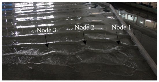 where and are the frequency and wave number (calculated by the dispersion relation with h the still water depth) with T and L being the period and the wave length, A and are the incident wave amplitude and propagation angle. For the case of sloping bottom considered here, the wave number k will change with different locations due to shoaling effect, but the above pattern of the longshore standing wave still remains unchanged as indicated by the Snell’s law (the subscript zero indicates the value at offshore boundary, the horizontal bottom). Therefore, the node points and anti-node points will be located along fixed straight lines, the node lines and the anti-node lines, and the theoretical wave length of longshore standing wave (the distance between two nodes) determined by will be constant. Figure 2 shows such wave fields for regular wave with period on the planar beach. Due to the finite length of the structure, the reflection wave area has a limited extent and the number of node points (or node lines) of the longshore standing waves are thus finite, depending on water depth, wave period and incident angle. The effect of wave period is not considered here by presenting only the experimental result for a fixed wave period, . The wave height corresponding to the wave period was chosen to be different for different experimental cases, as shown in Table 1.