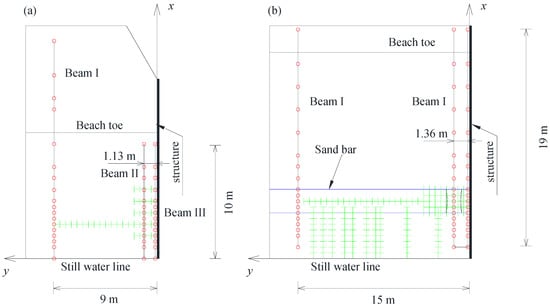 Diagram of the layouts of wave gages (red circles) and ADVs (green crosses) for the measurements of free surface elevation and flow velocity. (a) Planar beach; (b) barred beach (Test B or C, without or with a channel). The sandbar is indicated by the blue lines.