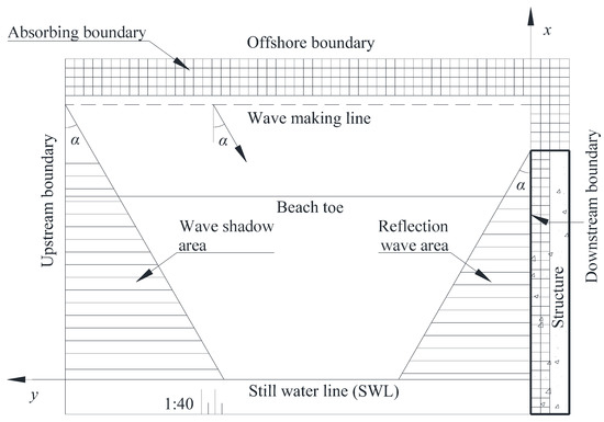 A rectangle computation domain is adopted with its size and four boundaries set according to the computation task. Figure 4 illustrates the computation domain used for the present study. The coordinate system (x, y) is set with the origin at the downstream end of still water shoreline, the x-axis directing offshore and y-axis away from the structure (the same as in the experiment). The slot technique is applied for the moving shoreline boundary and the internal wave making technique is used for the incident wave boundary [39]. The parameters for slot shape controlling are chosen to be and [12].The offshore boundary behind the wave making line is taken to be the sponge layer of one wave length width to absorb the wave, with its damping coefficient taken in the following form [40]: