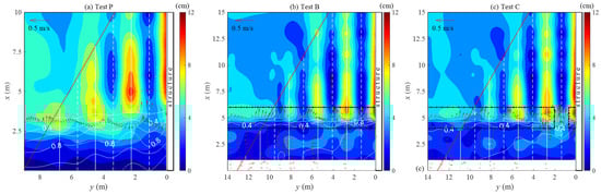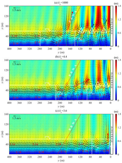 Secondly, the new formation mechanism of the deflection rip can be found on the planar beach for Test P: it is formed by the meeting and then deflection of the longshore current and lateral flow. The lateral flow, as the resistance of the longshore current penetration into the reflection wave area, now can be seen clearly from the numerical results in Figure 7a. This flow can also be seen for Test B and Test C, which has been validated from the good agreements to the results of ADVs. The formation of the lateral flow is due to the longshore decrease in the mean water level. This type of deflection rip is different from that studied in previous research [24,25,26,27,28,29], which was found just close to the structure due to the weak reflection of the structure. The effect of the wave reflection strength of the structure will be discussed in detail in the next Section.