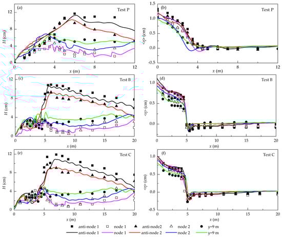 Comparison of wave height (a,c,e) and mean water level (b,d,f) between numerical results (curves) and measurements (scatters) for Tests P, B and C.