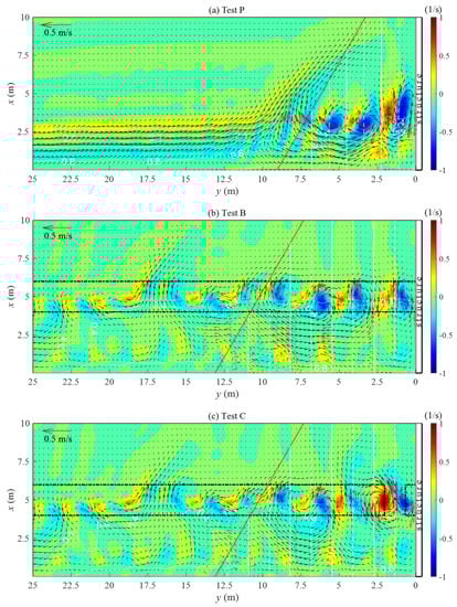 Figure 7 presents the calculated vorticity field, mean water level and velocity field for Tests P, B and C. For comparison with the measurements, the velocity vectors obtained by the ADVs are also given. The good agreements between them can be seen in the figure. Therefore, the features of the velocity fields stated above (in Section 4.2) can be analyzed more clearly with the help of numerical results. Firstly, the rip current system is composed of deflection rip current and node rip current for all the three tests. However, the deflection rip currents for Test B and C were not measured by the ADVs because it is located far away from the structure (Figure 7b,c). The difference between them can be seen from the mean flow circulation formed by them in Figure 7a. The deflection rip current flows out of the surf zone and does not turn back to the shore region (for the limited computation area here, it flows into the wave making region and then leaves the computation domain through the offshore boundary); it is an “exit flow”. However, the node rip current does not flow out of the surf zone: it turns back at the anti-node and forms a pair or a group of the circulation cells (large-scale vortices); the node rip is not “exit flow” but a “circulatory flow”.