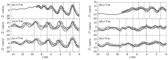 In order to further validate the numerical results, Figure 8 presents the corresponding time-averaged cross-shore and longshore velocity components (, ) along the wave breaking line x = 3 m for the planar beach and bar crest line x = 5 m for the barred beach. It is seen that the velocity distribution of the numerical results, both the velocity amplitudes and the locations of the node rips, agree very well with the measured data. These agreements demonstrate the bottom friction coefficient and mixing coefficient given in Section 3.1 are suitable in the present model.