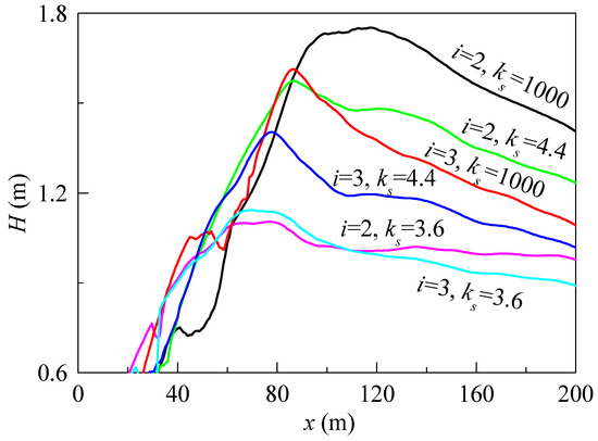 The damping mechanism is the same as above, but the value of and (= 2) is different. , 4.4 and 3.6 are taken here to simulate the total, stronger and weaker wave reflection strength of the structure. The value has the same function of with leading to ; therefore, this choice corresponds to the non-damping of the waves (total boundary reflection). The other two partial reflection cases with ks = 4.4 and 3.6 have been validated by giving the standing wave heights at the anti-nodes, as can be seen in Section 5.1.