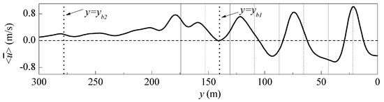 To describe the above deflection rip quantitatively, the offshore flow volume rate of it is examined here, as it is an effective measure of the flow strength of the “exit flow” of the rip current system. One important thing for this examination is that it is not equal to the flow volume rate of incoming longshore current, although this rip flow is formed by the offshore deflection of this longshore current. This means that there are other contributions to the flow volume rate and the sources of these contribution are the concern here, from which the formation mechanism of deflection rip flow can be found. For this examination, the longshore extension of the deflected longshore current needs to be defined first and this is illustrated in Figure 11, which presents the longshore profiles of the cross-shore velocity along wave breaking line (determined according to the beginning of wave breaking outside the wave reflection area). The node rip can be identified in the figure by the alternative appearing of offshore (positive value) and onshore (negative value) velocities: the extent and value of offshore velocity indicate the width and magnitude of the node rip, and the deflection rip can be identified as the flow with only a single sign, the positive sign (flowing offshore). According to this, a cross-shore dividing line which going through the point of last zero velocity, , can be drawn as the boundary between the node rip and the deflection rip, which is called the deflection rip down boundary hereafter. The area between it and the structure is called the inner domain hereafter, as it contains only the node rips. Apart from this boundary, another boundary, the deflection rip upper boundary, also needs to be defined, and this is demonstrated by the line , which is defined as the position beyond which the reducing of uniform cross-shore volume flux of longshore current is less than 5%. The area between the above two lines is the area of deflection rip and is called the outer domain hereafter (the area beyond is the domain of uniform incoming longshore current). Based on the above definitions, the amount of offshore flow volume rate of deflection rip can be calculated by the depth integration of offshore (positive) velocity on the segment of line between above two vertical lines, i.e.,