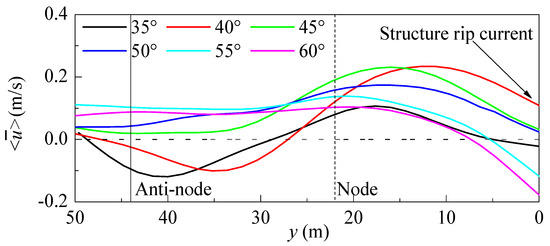 On the contrary, for the larger angle , the reflection wave area is much larger and contains a larger number of nodes (ten), the incoming longshore current penetrates into the reflection wave area a large distance and leads to three node rips being covered by the deflection rip current, with only seven node rips remained in the inner domain. Another special flow feature is the extra offshore current appearing near the structure, called structure rip hereafter. This flow is apparently not a node rip, as the location of it being near the 1st anti-node along the structure wall (the onshore flow over this anti-node disappears). This flow also leads to the 1st node rip becoming an offshore “exit flow” due to the two flows being very close to each other. As such a flow is not found for the mid large wave angle (see Figure 11), its appearance is apparently due to the large wave incident angle. To give the detailed description of this flow, the other larger wave incident angles up to are considered, the corresponding longshore distributions of cross-shore velocities at x = 120 m together with the result of are given in Figure 13. The results show that the condition for appearing of structure rip is , indicated by being offshore directed for these cases but being directed onshore for and (the normal onshore flow at an anti-node). The reason for the appearance of this type of offshore flow is the shifting of 1st node rip towards the structure. The similar shifting also appears for the case in Figure 11. This shifting can attribute to the reduced wave reflection on the structure, as for the strong wave reflection there is not such a shifting (as seen in the same figure). However, the shifting here is due to the stronger longshore current in the outer domain and the weaker lateral flow in the inner domain which appears companying the increasing in wave angle. This can be confirmed in Table 3 for : with increasing wave angle, the former increases to 27.1 m3/s in magnitude and the latter reduces to 0.53.