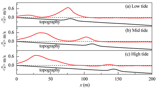 The cross-shore profiles of incoming longshore currents (red lines) for different water levels. The bar crests are at x = 80 m, x = 112 m and x = 144 m for the three water levels, respectively.