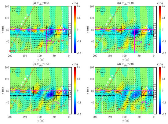 To investigate the channel effect on the rip current flow pattern, the above analysis is extended by cutting a channel through the bar to allow the mean flow pattern to be influenced by the channel. The existence of the channel reduces the mean water level and wave height over the channel area, thus producing the time-mean offshore flow (the channel rip) converging towards the channel. Four channel widths are chosen to examine the channel rip, which are , , and ( is the wavelength of the longshore standing wave), respectively. The central lines of all the channels are located at the 3rd theoretical anti-node point (87.2 m away from the structure). As the anti-node is the location where the onshore flow will occur, the location of the rip channel chosen above will invert the flow by inducing a channel rip. This is because the decrease in the mean water level and wave height induced by the channel was larger than that owing to the location being an anti-node. Only the low water level is considered because the effect of the bar in this case is the strongest among the three water levels, as seen in the previous section.