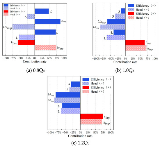 Under the 0.8Qd condition, each factor has opposite effects on efficiency and head performance. Specifically, L, L/himp, and S positively affect efficiency, while the head is negatively correlated with them. The contribution of each geometric parameter to efficiency can be ranked as follows: L/himp > L > himp > S; and for head performance, the order is L/himp > himp > L > S. Based on the correlation analysis, it can be concluded that smaller L/himp and higher himp lead to higher efficiency and head performance under design flow and large flow conditions. However, larger L/himp and lower himp under small flow conditions result in higher efficiency and lower head performance.